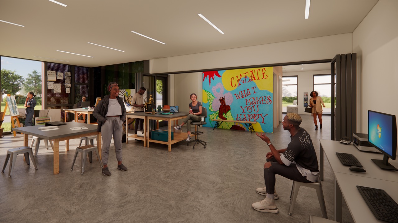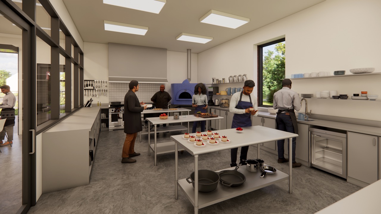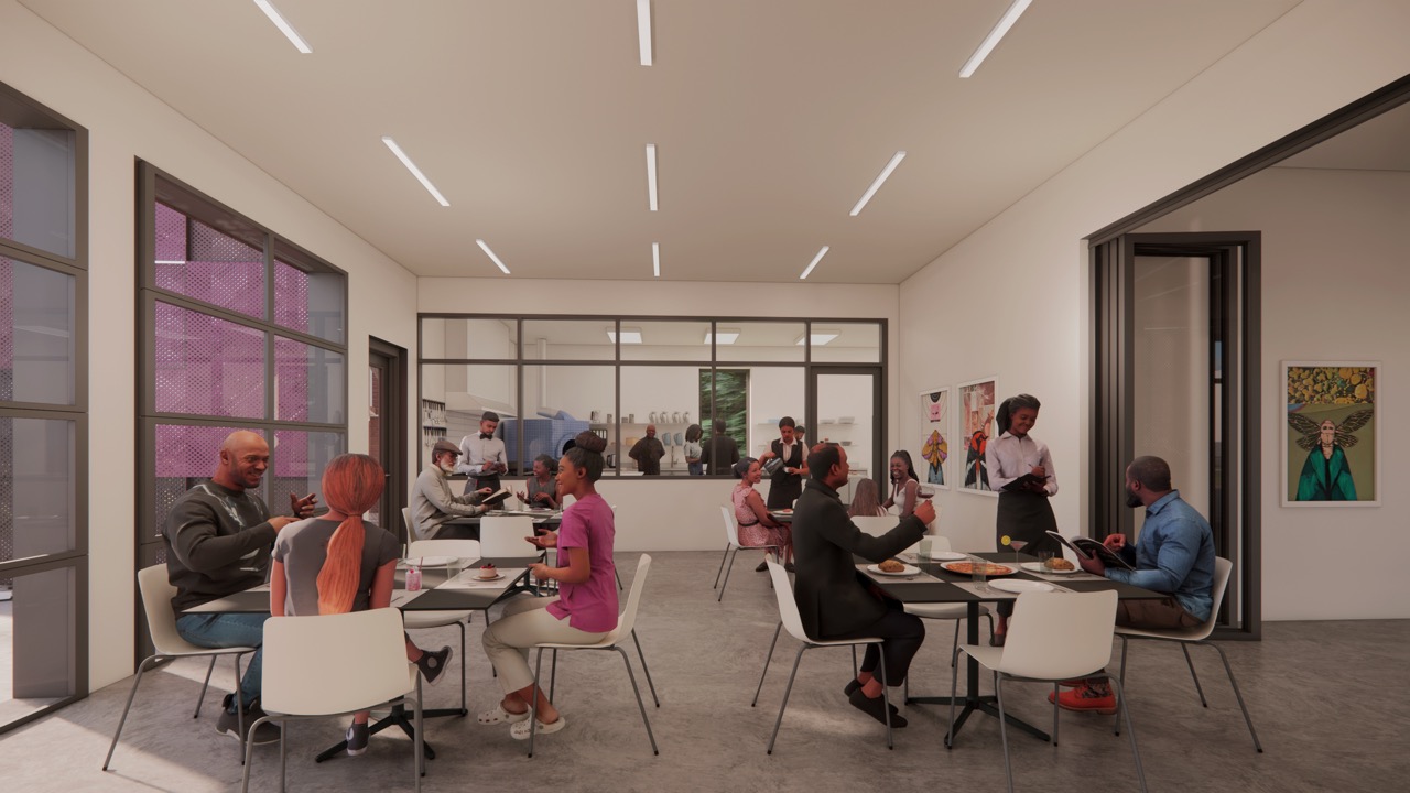 Programmatically, the space is a hybrid: part community center, part educational studio, part transitional housing. Flexible interiors support workshops in cooking and art-making, while also accommodating public events and community outreach. Above, modest residential units offer returning citizens a safe place to live and reorient.