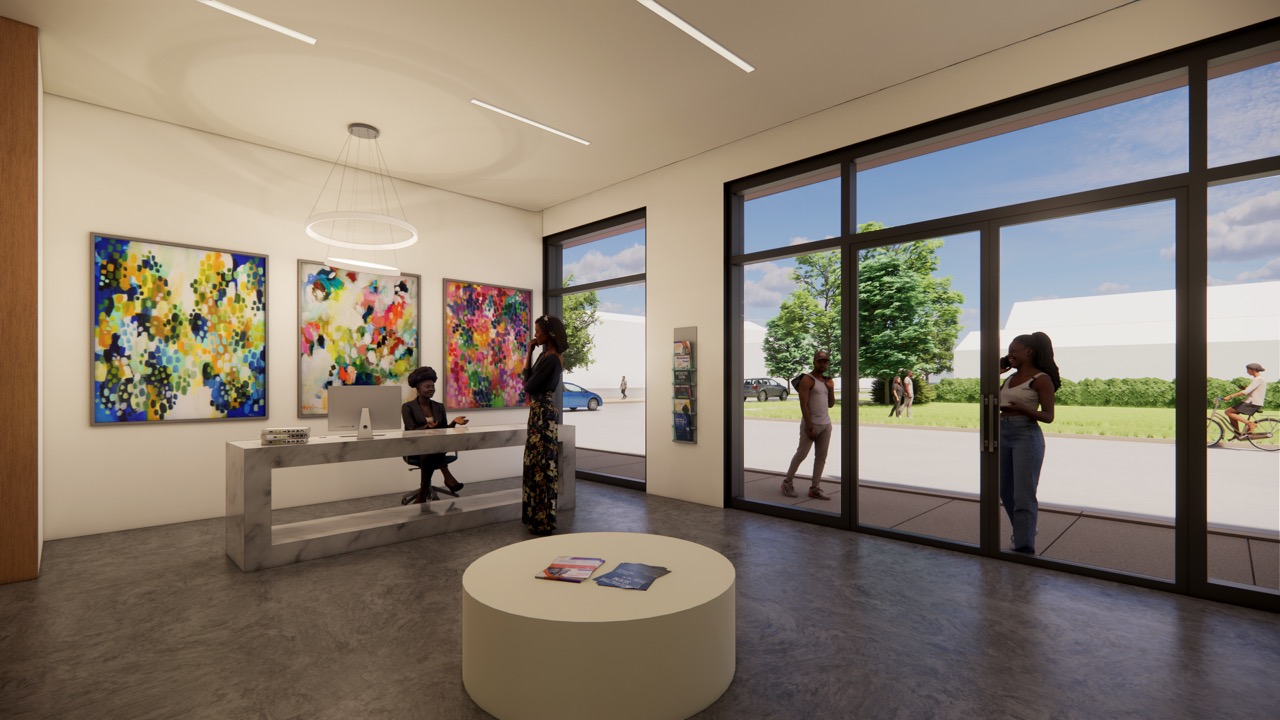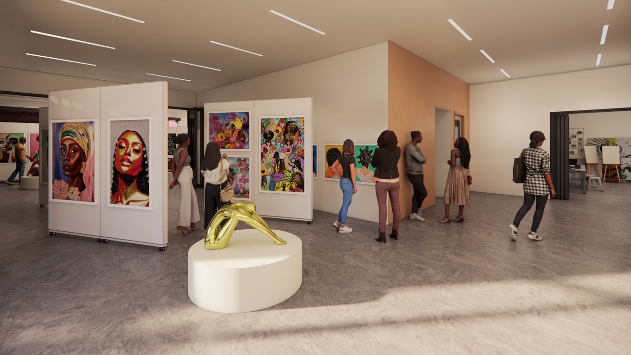 The facade is clad in custom metal panels derived from one of Ndume’s paintings, transforming personal expression into architectural identity. This gesture is not symbolic – it is foundational. The building, like the man who imagined it, reclaims authorship and offers it to others. A mural representing prominent Black St. Louisans wraps the corner, serving as a reminder that this is a place to be proud of.